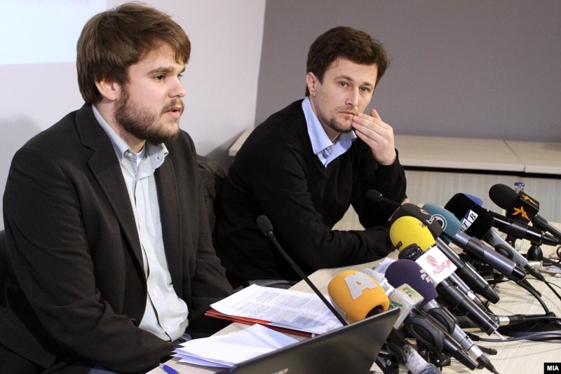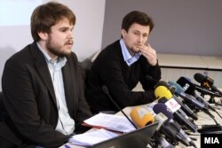 Анастас Вангели и Башким Бакиу од Центарот за истражување и креирање политики на прес-конференција во Скопје