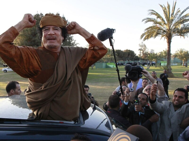 Од друга страна, пак, Гадафи изјави дека „ќе остане во Либија до крајот“ и ги повика своите поддржувачи ширум земјата да му помогнат да го ослободи градот од бунтовничката офанзива. Во аудио пораката која ја емитувала државната телевизија, Гадафи изјави дека „се плаши оти Триполи ќе гори“. Тој додава дека ќе им обезбеди оружје на своите првизаници кои ќе се борат со бунтовниците.