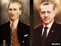 Турскиот премиер Реџеп Таип Ердоган држи говор пред портретот на Кемал Ататурк