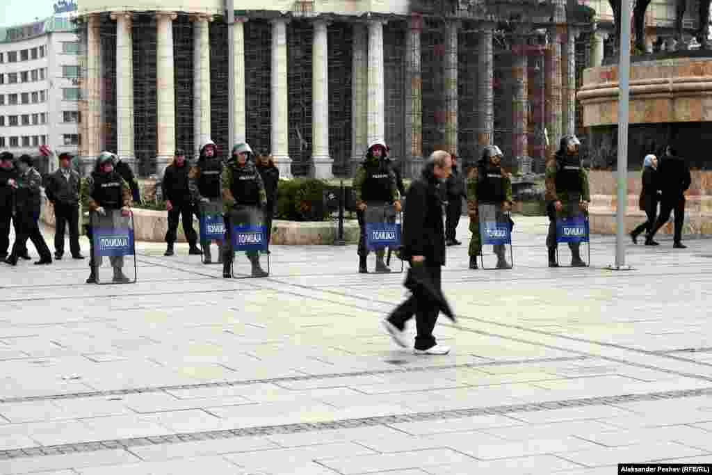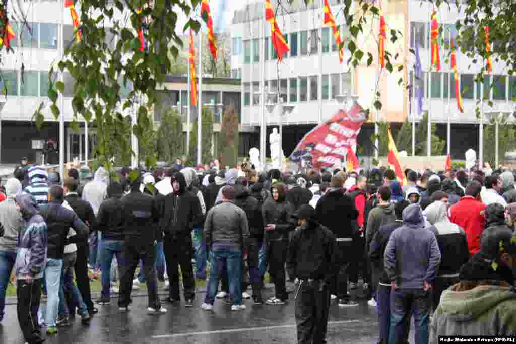 Од протестите во Скопје пред владината зграда по убиствата на 5 те луѓе во Смиљковци. Демонстрантите фрлаа камења врз владата а беа оштетени и полициски автомобили. 16.04.2012. РСЕ