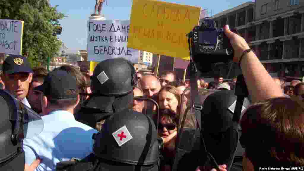 Во тензична атмосфера помина протестот на новинарите за поддршка на новинарот Томислав Кежаровски. Новинарите се обидоа да го поминат полицискиот кордон, откако не им беше дозволено да протестираат пред Музејот на македонската борба за државност и самостојност, односно Музејот на ВМРО во Скопје, по што дојде до туркање со полицијата. Протестот го обезбедуваа речиси ист број на полицајци колку што имаше и демонстранти.
