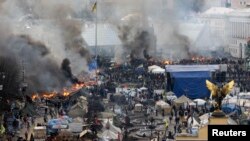 Во текот на изминатата ноќ опозициски активисти останале на плоштадот Мајдан опколени со оган и чад од запалените шатори и од припадници на специјалната полиција.