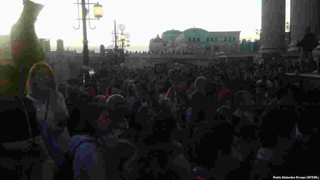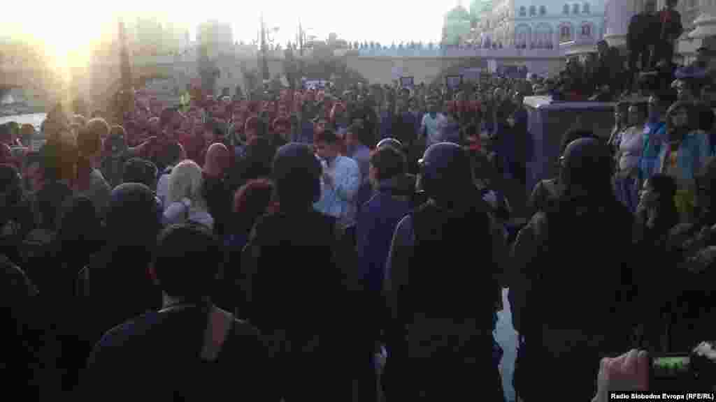 На демонстрантите кои протестираат против полициска бруталност не им се дозволува да дојдат до Јавното обвинителство. Полицискиот кордон е поставен пред зградата на Државниот архив и демонстрантите се на кејот од Вардар или на мостовите дел од Скопје 2014.