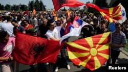 На протестите кои следуваа пред Владата, каде што демонстранти бараа оставка од владиниот врв, се забележуваа врзани македонски, албански, ромски, турски и ромски знамиња.