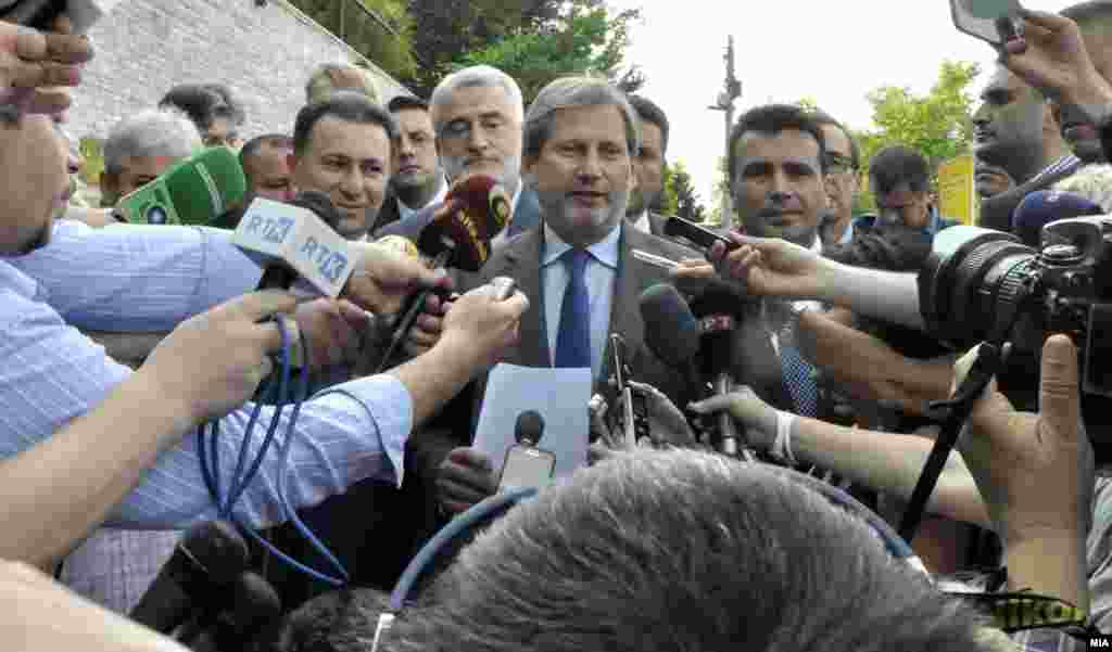 Груевски, Заев, Хан, а потоа и Ахмети и Тачи со часови трагаат по решени за кризата зад затворени врати. Во меѓувреме за новинарите кои чекаат пред резиденцијата на ЕУ во Скопје се постави чадор и ручек.