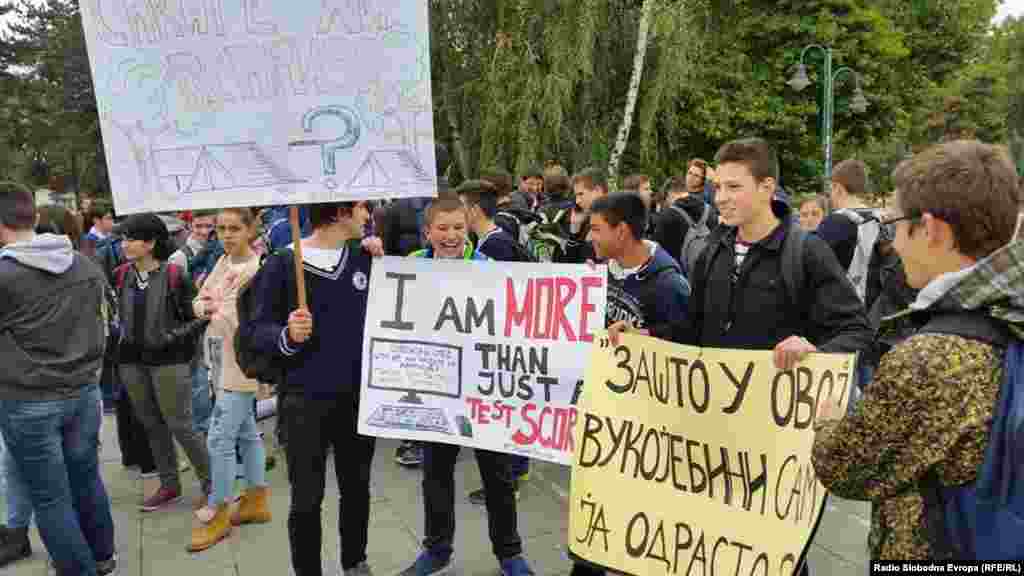 Стотици средношколците маршираат по скопските улици под мотото „Борбата продолжува“ против лошите реформи во образованието. „Што е битно што имам на екстерно кога и со 1 може да бидам премиер“, пишува на еден транспарент.