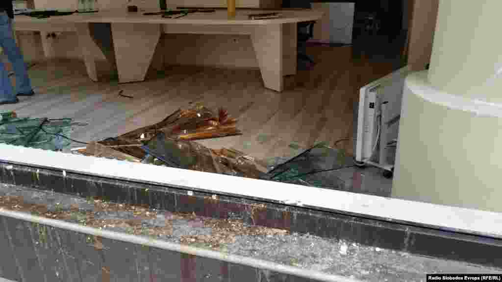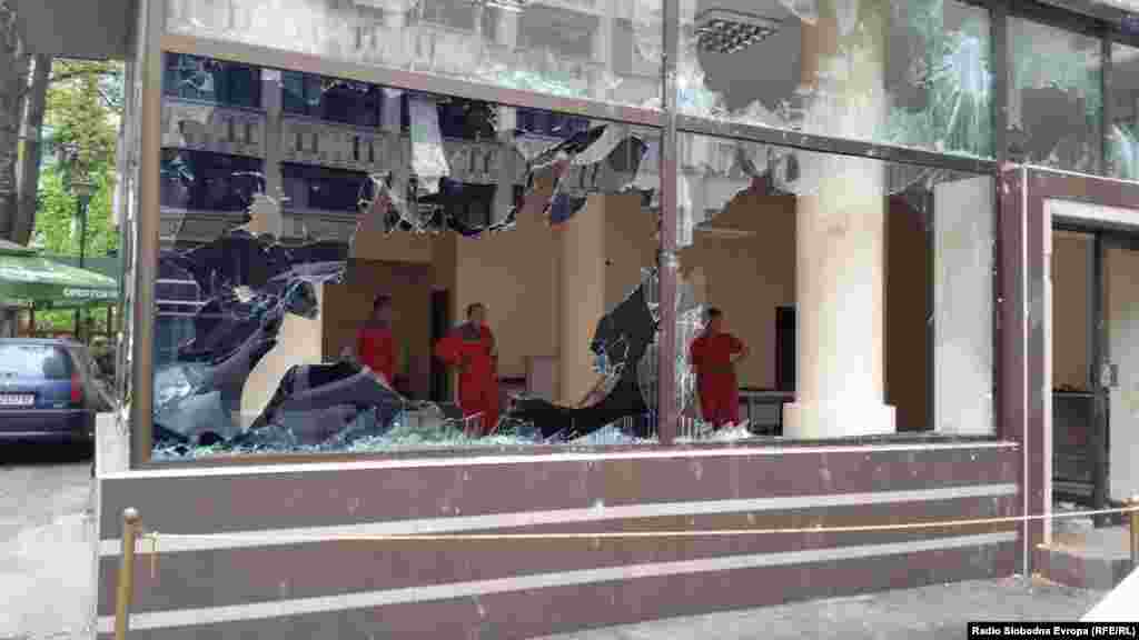 Искршени стакла и оштетена фасада на Народната канцеларија на претседателот на Македонија Ѓорѓе Иванов и на Министерството за правда по синоќешните протестите против одлуката на претседателот да помилува политичари од власта и опозицијата.