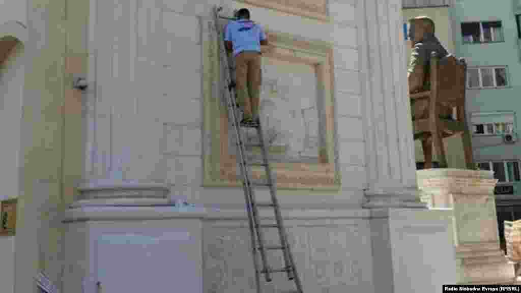 Работници денеска ја чистат Триумфалната порта во центарот на Скопје, откако анти-владините демонстранти синоќа ја гаѓаа со боја, а испишаа и графит „Грабеж“. Откако на демонстрантите, не им беше дозволено да протестираат пред Собранието, тие фрлаа со боја кон Портата, која е дел од контроверзниот проект Скопје 2014, по што го продолжија протестот пред владата.