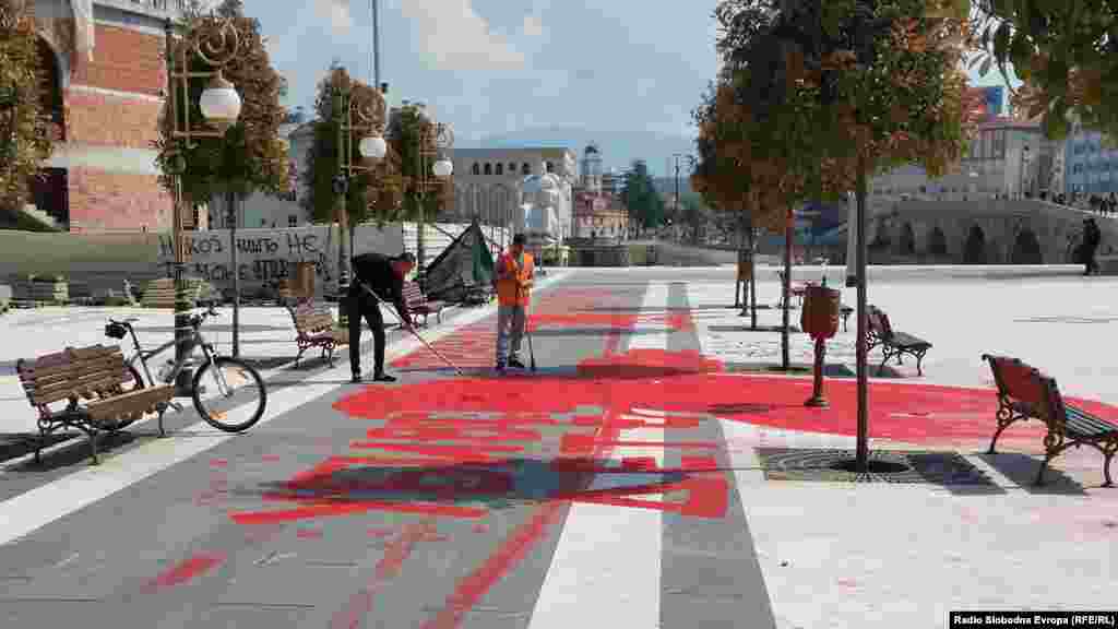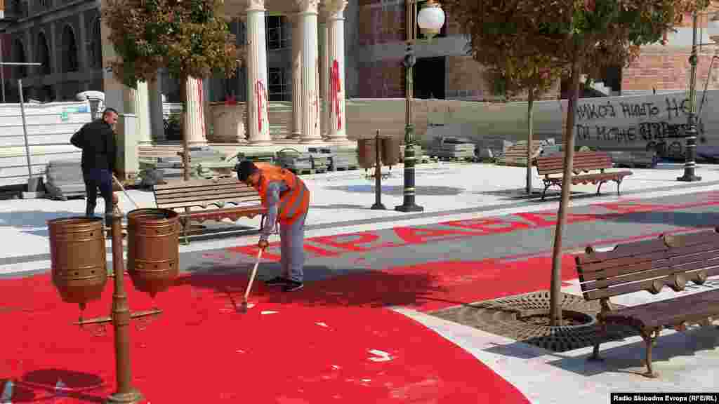 Работници го чистат плоштадот Македонија во Скопје, откако демонстрантите синоќа испишаа пораки „Убијци“, „Правда за Мартин“, „Бојата се мие, крвта не се крие“ со црвена боја, потсетувајќи на убиството на Мартин Нешкоски. Тој беше убиен пред пет години, но никој не одговараше за обидот за прикривање на неговото убиство.