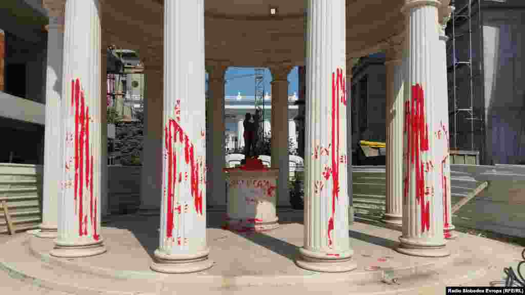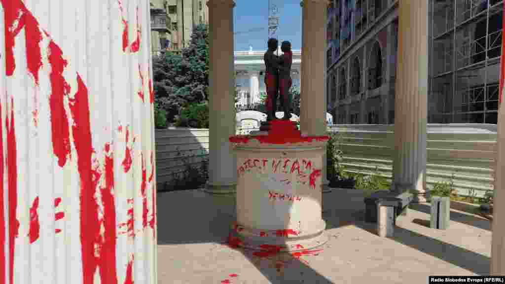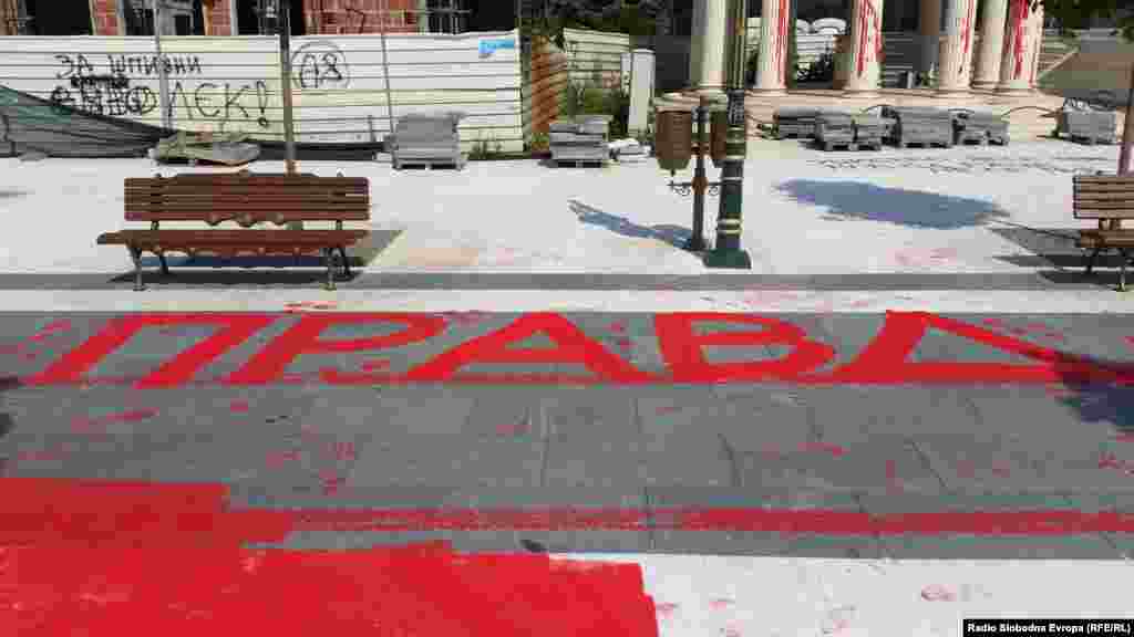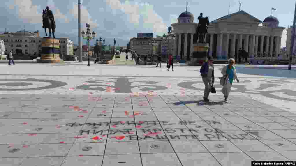 Работници го чистат плоштадот Македонија во Скопје, откако демонстрантите синоќа испишаа пораки „Убијци“, „Правда за Мартин“, „Бојата се мие, крвта не се крие“ со црвена боја, потсетувајќи на убиството на Мартин Нешкоски. Тој беше убиен пред пет години, но никој не одговараше за обидот за прикривање на неговото убиство.