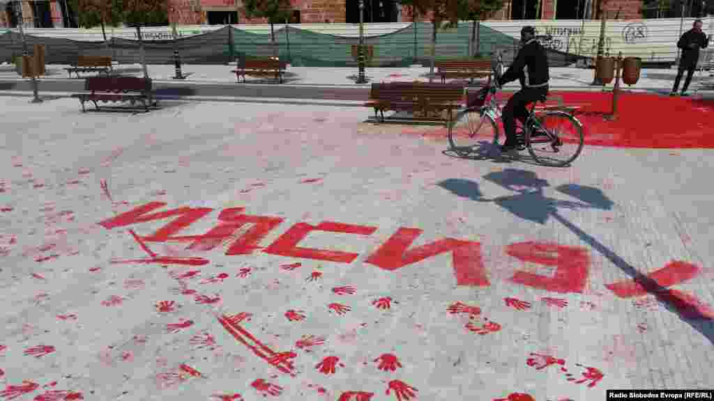 Работници го чистат плоштадот Македонија во Скопје, откако демонстрантите синоќа испишаа пораки „Убијци“, „Правда за Мартин“, „Бојата се мие, крвта не се крие“ со црвена боја, потсетувајќи на убиството на Мартин Нешкоски. Тој беше убиен пред пет години, но никој не одговараше за обидот за прикривање на неговото убиство.