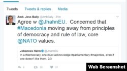 „Се согласувам со еврокомесарот Јоханес Хан. Загрижен сум дека Македонија се оддалечува од принципите на демократијата и на владеењето на правото, суштински вредности на НАТО“, напиша Бејли на Твитер, споделувајќи ја синоќешната порака на еврокомесарот за проширување Јоханес Хан, кој напиша дека „во една демократија, парламентарното мнозинство мора да биде признаено, дури и ако тоа не му се допаѓа некому.“