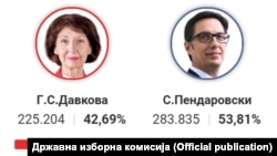 Според првичните резултати објавени на веб страницата на Државната изборна комисија од обработени 71,92 отсто од избирачките места, води претседателскиот кандидат на СДСМ и Коалицијата Стево Пендаровски со 53,81 проценти, пред кандидатката на ВМРО-ДПМНЕ и Коалицијата Гордана Силјановска Давкова со 42,69 отсто.