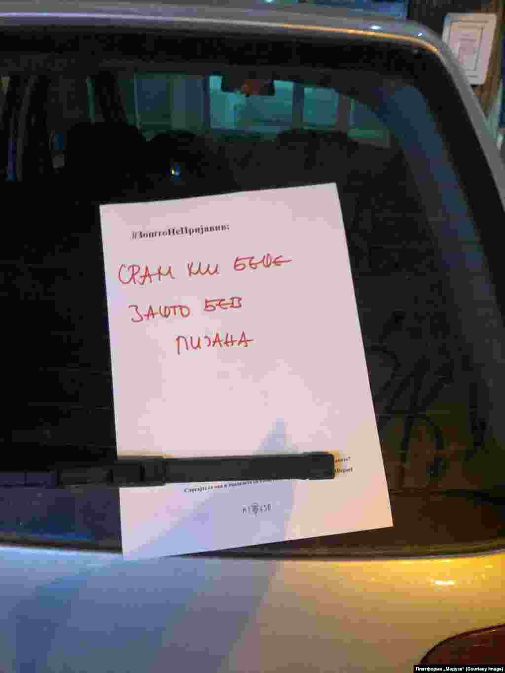 Анонимни одговори на прашањето „Зошто не пријавив“ залепени низ Скопје е нова герила акција на феминистичката платформа „Медуза“. Целта е да се нагласат причините поради кои најчесто жртвите не се осмелуваат да пријават насилство.