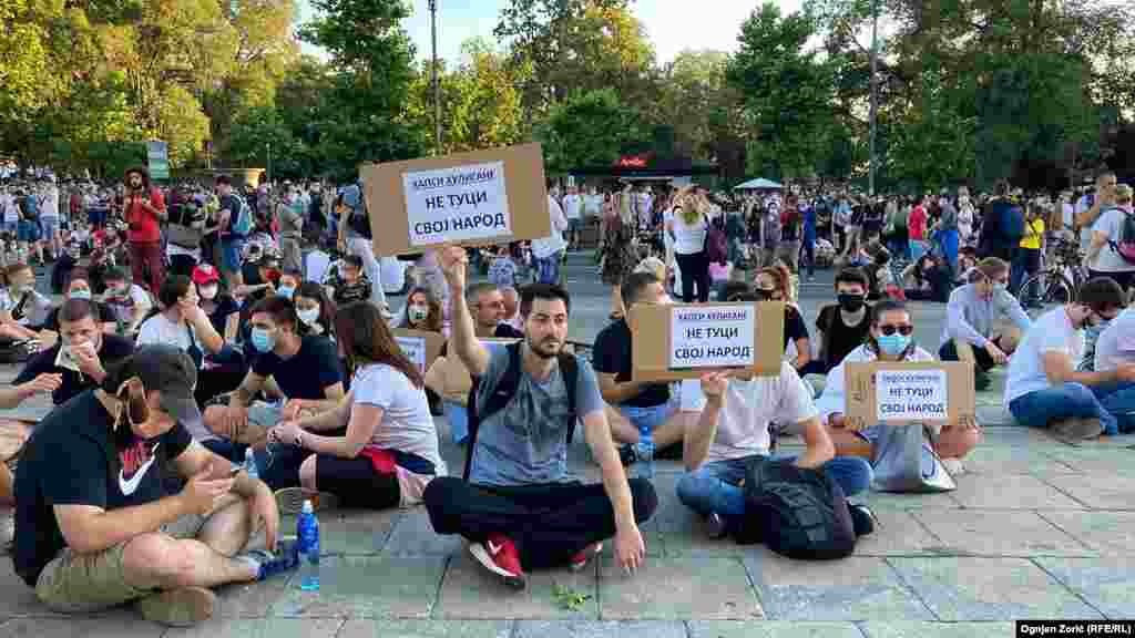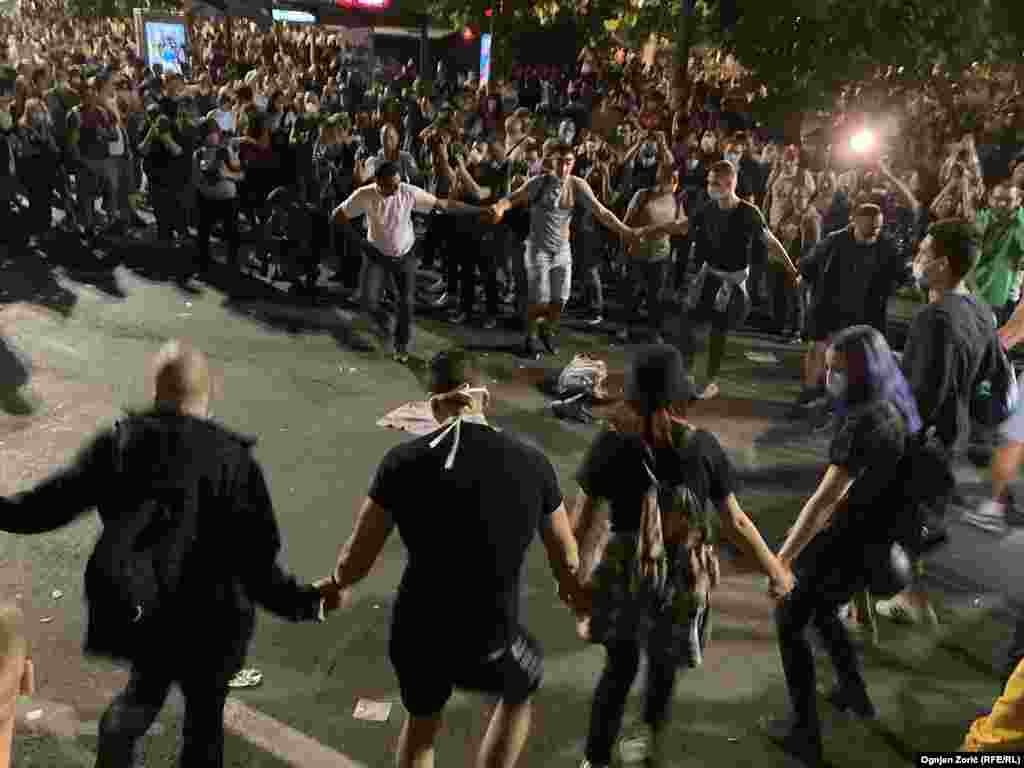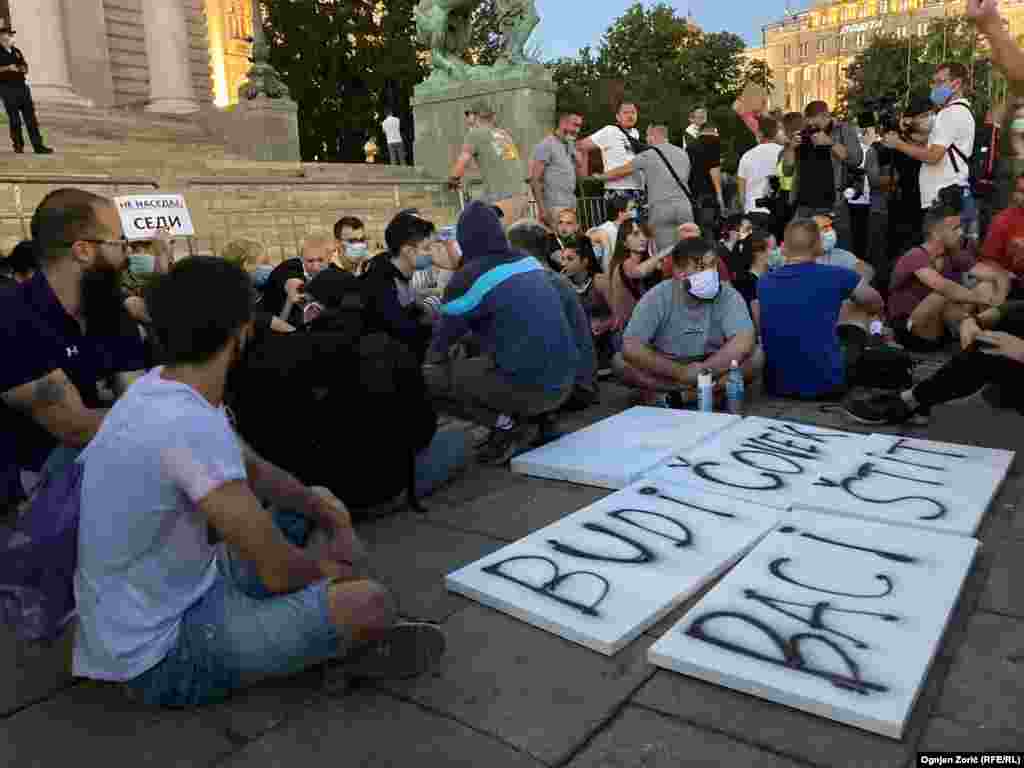 Српските граѓани трета вечер по ред се собраа пред зградата на Собранието на Србија во Белград. Голем дел со седење на улицата се оградија од групите и поединците кои на протестите во претходните две вечери се судираа со полицијата.