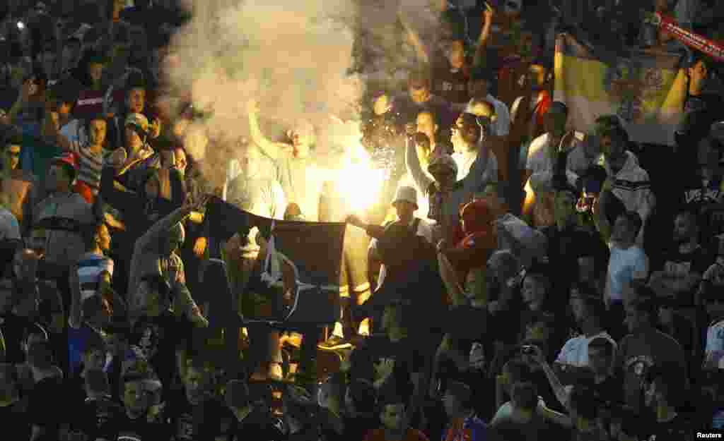Фудбалскиот натпревар меѓу репрезентациите на Србија и Албанија во Белград беше прекинат откако дошло до туркање и упаѓање на навивачи на теренот. Претходно на стадионот се појави летало на далечинско управување на кое бил закачен транспарент со албанското знаме и со карта на голема Албанија.