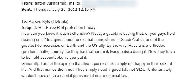 Во една од електронските пораки, тој вели дека членките на рускиот дисидентски уметнички колектив Пуси Рајот, кои во тоа време беа затворени поради организирање протест против Путин во главната руска православна катедрала во Москва, „едностварно не се среќни во својот сексуален живот“ и„едноставно им треба добар F..k“.