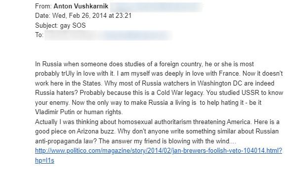 РСЕ дојде до електронска пошта што Антон Вушкарник му ги испратил на Кајл Паркер, главен соработник на американската Хелсиншка комисија, владина агенција која ги следи човековите права, во 2012-14 година.