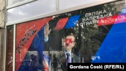 Во еден момент, дел од толпата ги ишкрта просториите на владејачката Српска напредна партија во белградската општина Савски венец.