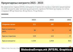 Во меѓувреме, продолжува и шверцот на мигранти. Во извештајот на МВР се објаснува како функционира криумчарењето. Мигрантите од Грција пеш влегуваат во Северна Македонија преку илегални влезови. Нив ги чекаат луѓе со моторни возила и ги носат до села во близина на границата со Србија. Транспортот се врши со патнички возила на кои се поставени лажни или пак регистарски ознаки од други возила, а во мал број случаи и со товарни возила и комбиња, а возачите откако ќе ги забележат полициските патроли, ги оставаат возилата со мигрантите покрај патот и бегаат.