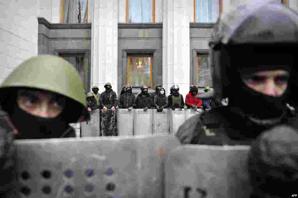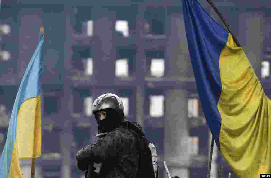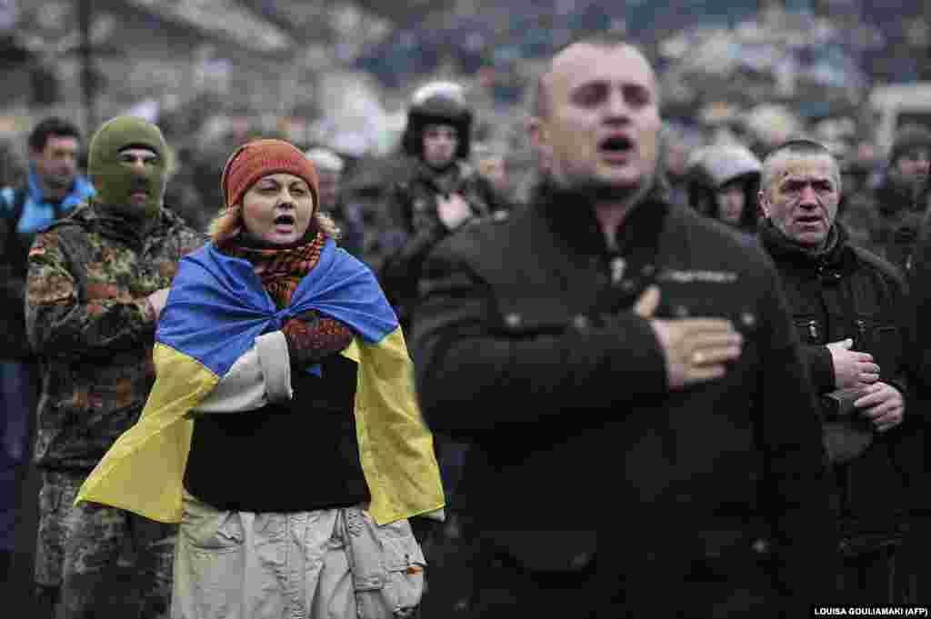По заминувањето на украинскиот претседател Виктор Јанукович од Киев антивладините демонстранти ја презедоа контролата врз владините згради и претседателски палати. Во исто време се одржаа многу комеморации по жртвите од тримесечните протести во Киев.