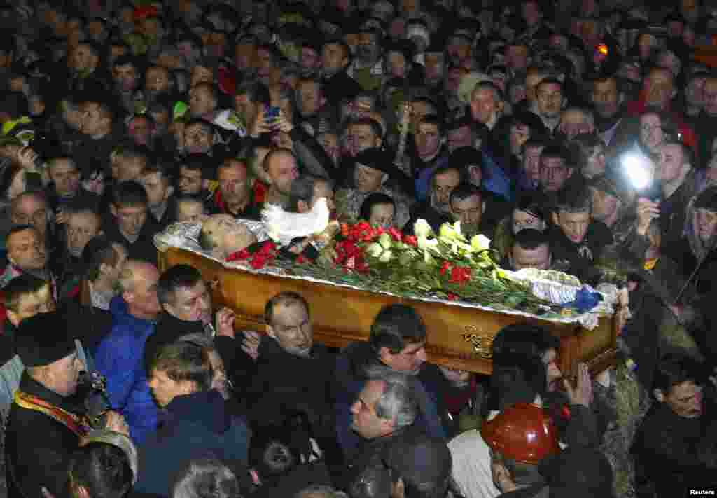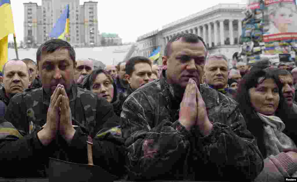 По заминувањето на украинскиот претседател Виктор Јанукович од Киев антивладините демонстранти ја презедоа контролата врз владините згради и претседателски палати. Во исто време се одржаа многу комеморации по жртвите од тримесечните протести во Киев.
