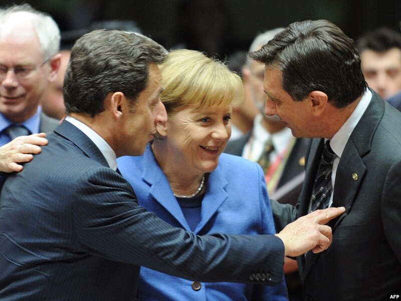 Претседателот на Франција Никола Саркози, германскиот канцелар Ангела Меркел и премиерот на Словенија Борут Пахор на ЕУ самит